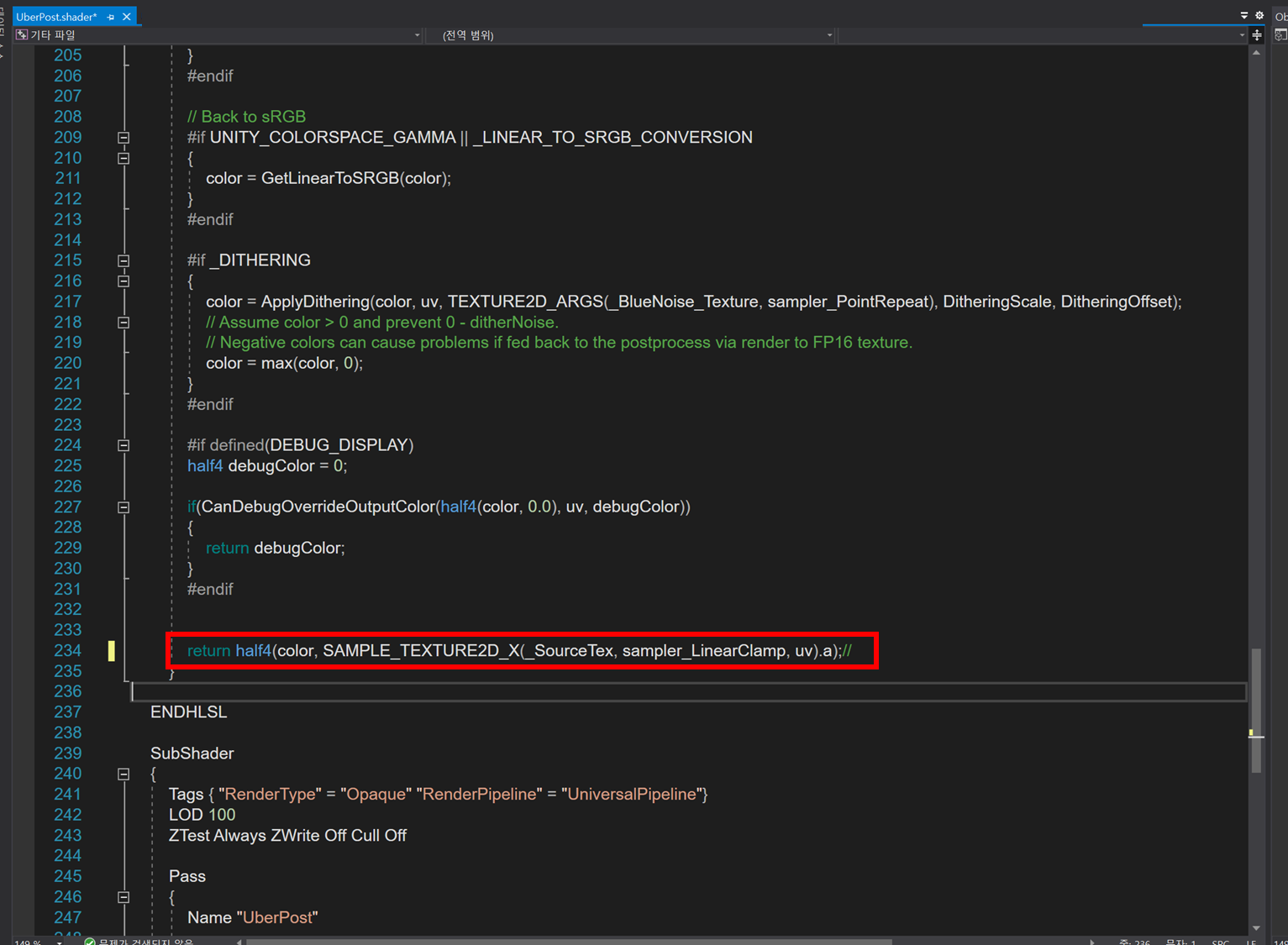 3. UberPost.shader의 (위치:Packages-Universal RP-Shader-PostProcessing-UberPost)