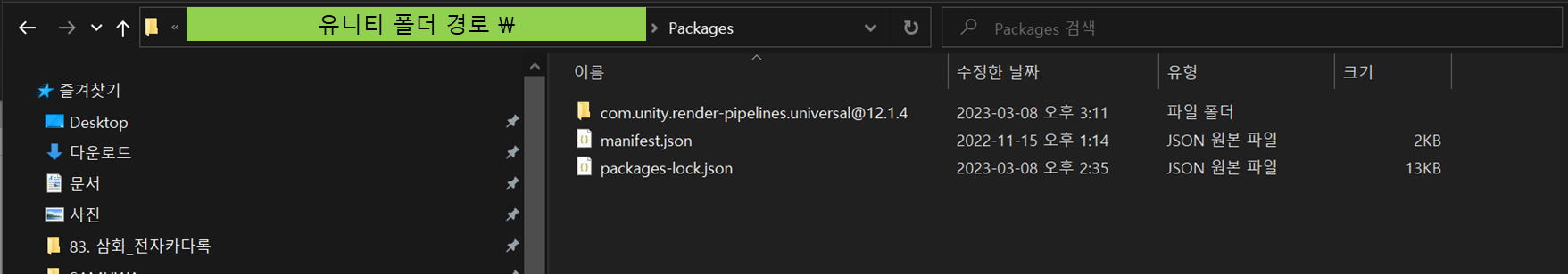 Library/PackageCache 폴더에서 [com.unity.render-pipelines.universal@12.1.4]폴더 삭제