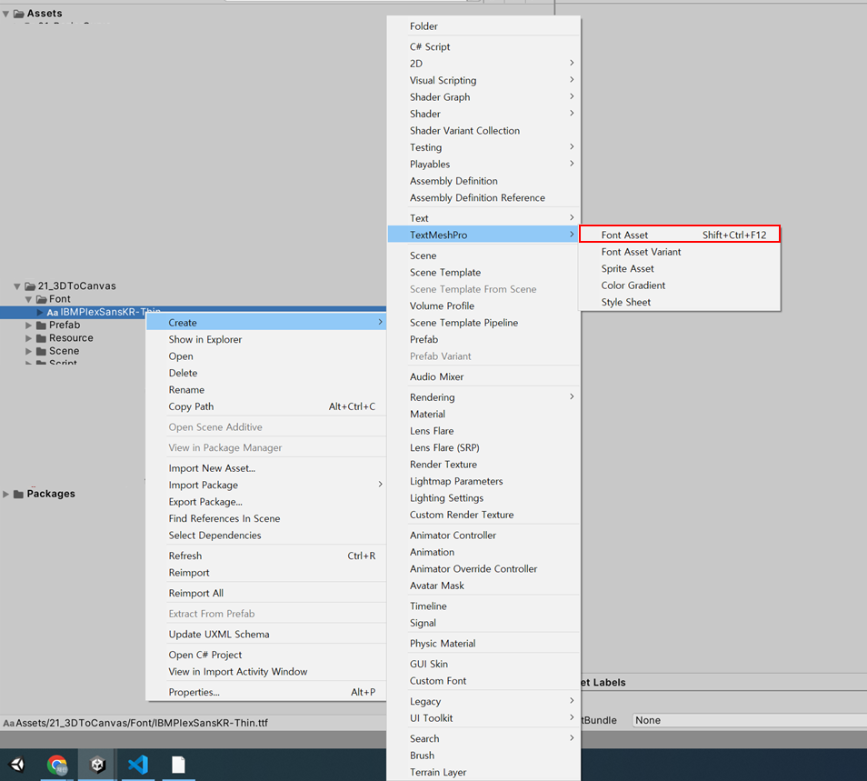 2. 폰트오른쪽클릭>Create>TextMeshPro>Font Asset 클릭