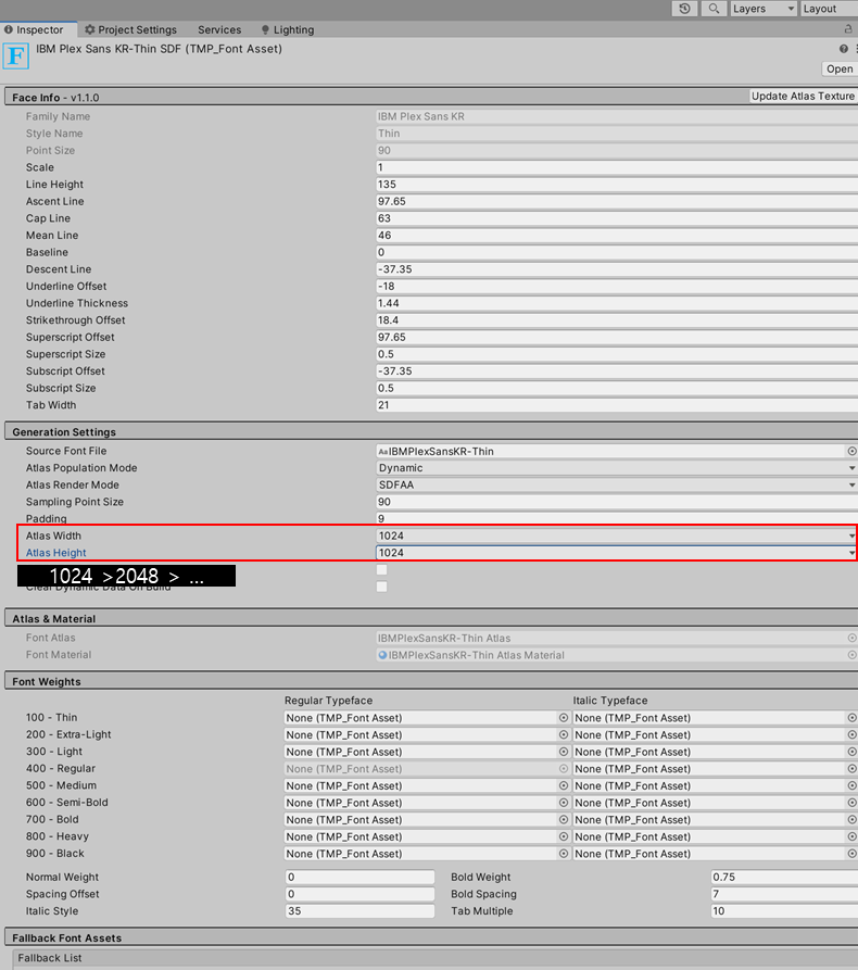 TMP_Font Asset 클릭 > Altas Width,Altas Height 값 더 크게 수정