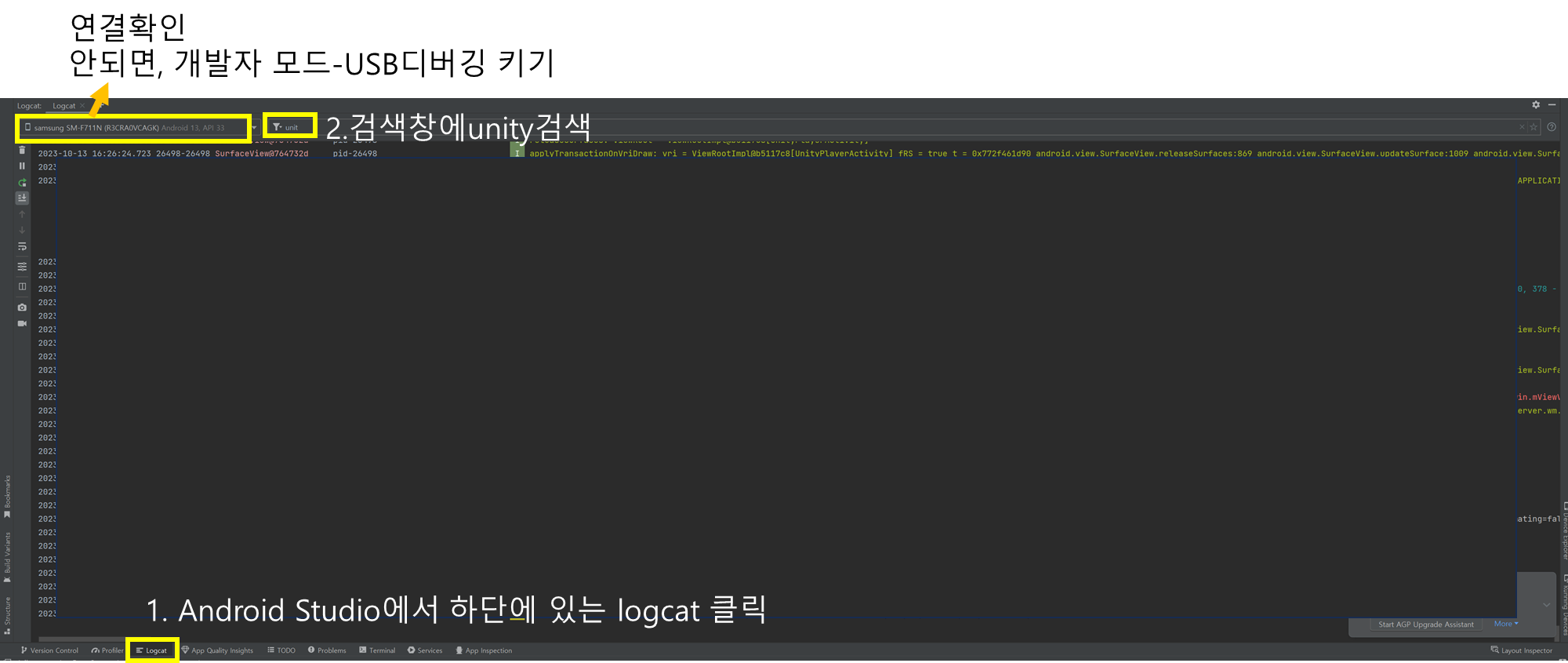 2. 하단의 logcat버튼을 누른다